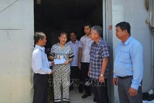 Lãnh đạo Văn phòng Ban Chỉ huy Phòng thủ dân sự - Phòng chống thiên tai và Tìm kiếm cứu nạn thành phố Cần Thơ và lãnh đạo xã Thạnh Phú trao tiền hỗ trợ cho người dân có nhà bị thiệt hại do dông lốc. Ảnh: TTXVN phát |