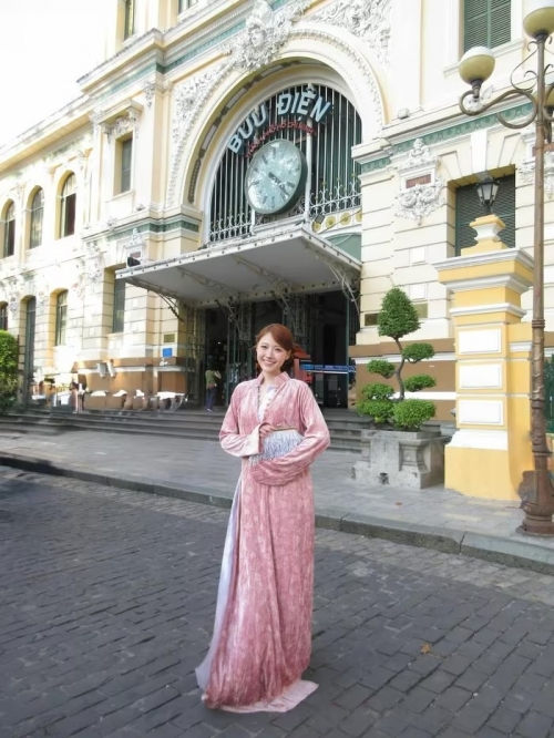 Cô tự làm người mẫu quảng bá sản phẩm của thương hiệu mình, diện lên người một thiết kế có nhiều điểm giống với tà áo dài truyền thống, song hoàn toàn không cài khuy trước ngực.
