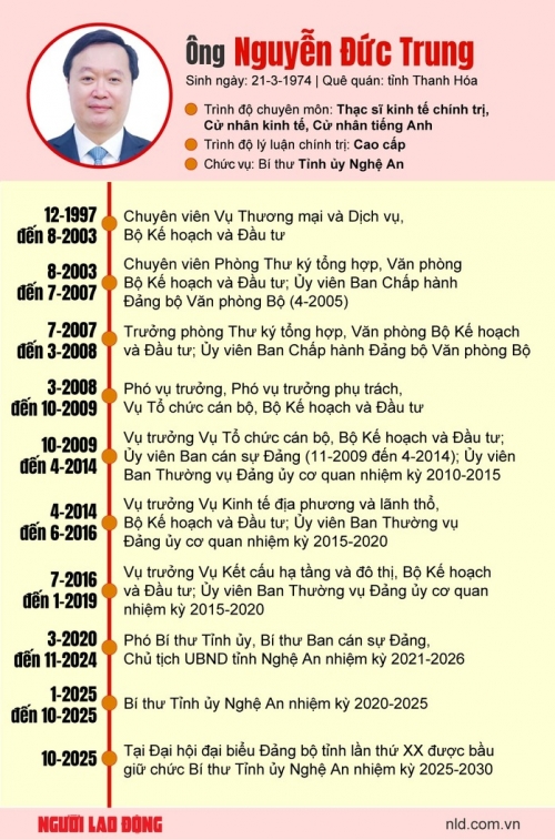 Theo quyết định của Bộ Chính trị, ông Nguyễn Đức Trung, Bí thư Tỉnh ủy Nghệ An, thôi tham gia Ban Chấp hành, Ban Thường vụ và thôi giữ chức Bí thư Tỉnh ủy Nghệ An, nhiệm kỳ 2025-2030; điều động, chỉ định tham gia Ban Chấp hành, Ban Thường vụ Thành ủy và giữ chức Phó Bí thư Thành ủy Hà Nội, nhiệm kỳ 2025-2030.