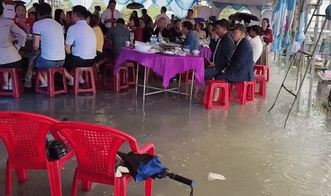 Mưa lớn gây ngập tại khu vực dựng rạp, khách tới dự đám cưới của cô dâu Quảng Trị đành cởi giày, lội nước vào ngồi dùng tiệc.