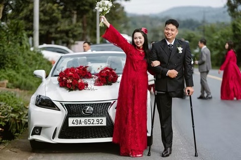 Chú rể 1 chân chống nạng vào đón cô dâu khiến cả hôn trường xúc động