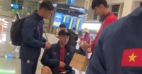 Tiền vệ Nguyễn Văn Trường băng bó kín đầu gối phải, ngồi xe lăn về nước sau khi kết thúc Giải giao hữu Panda Cup tại Trung Quốc cùng U22 Việt Nam.