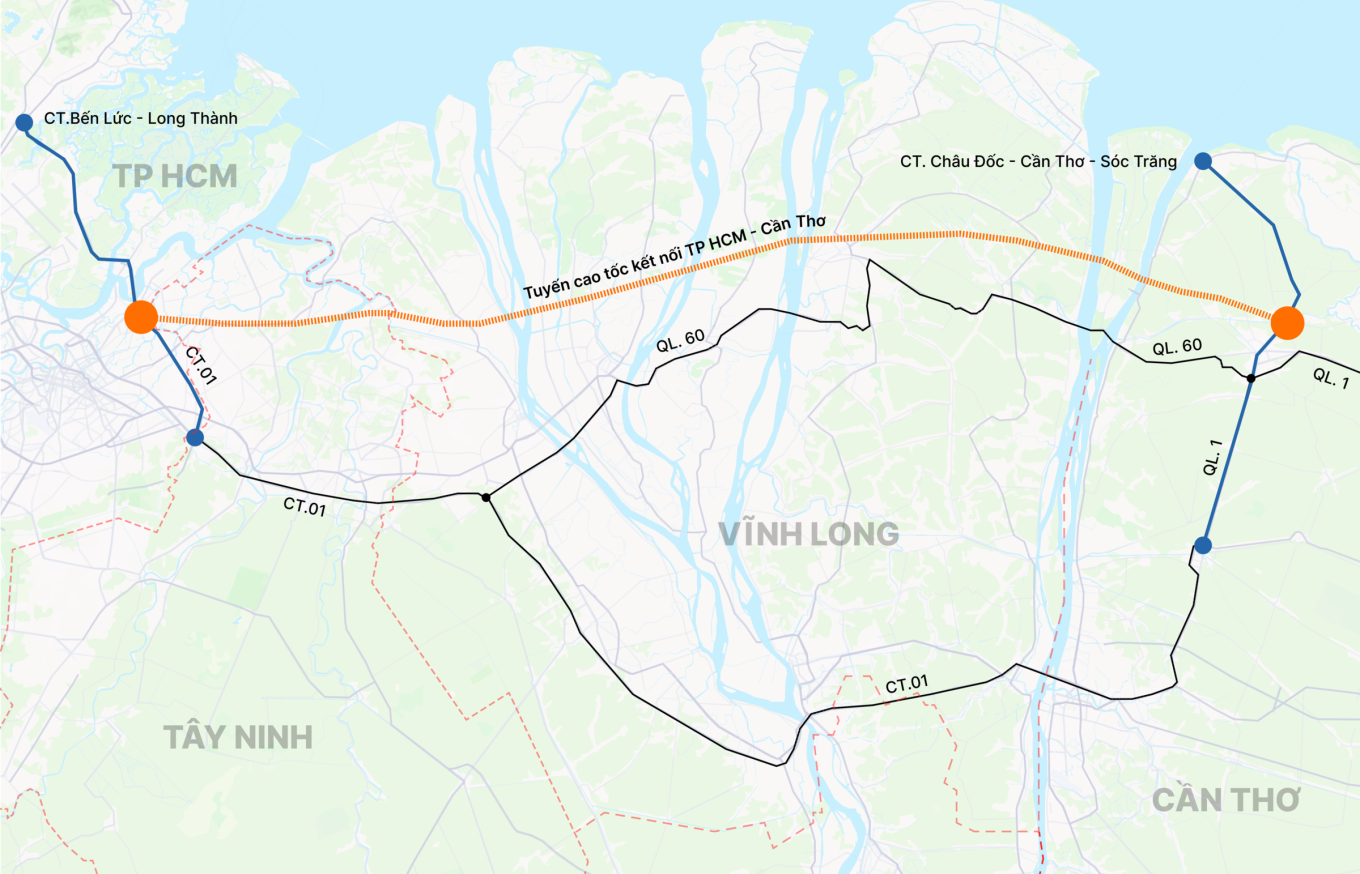 Cao tốc dài khoảng 150 km nối TP HCM với Cần Thơ, đi qua Tây Ninh, Đồng Tháp và Vĩnh Long, được đề xuất nhằm tăng liên kết vùng và mở không gian phát triển mới.