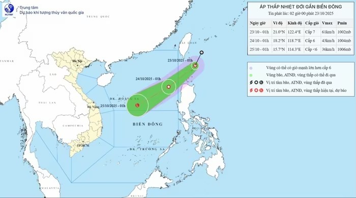 Theo Trung tâm Dự báo khí tượng thủy văn quốc gia, hồi 1h ngày 23/10, vị trí tâm áp thấp nhiệt đới ở vào khoảng 21,0 độ Vĩ Bắc; di chuyển theo hướng Nam Tây Nam với tốc độ khoảng 10-15km/h.