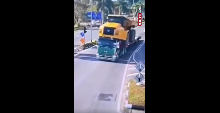 Khoảnh khắc xe đầu kéo bị nghiền nát bởi máy móc hạng nặng do phanh gấp