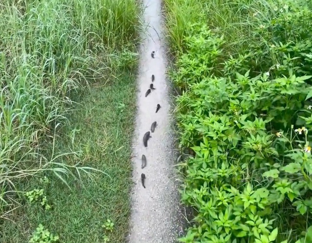 Chứng kiến cảnh đàn cá rô đồng xếp hàng trật tự di chuyển trên đường, nhiều người không khỏi thích thú.