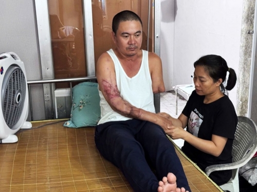Do tổn thương nặng vì tai nạn lao động nên mọi sinh hoạt của anh Trần Văn Thành đều phụ thuộc vào vợ. |