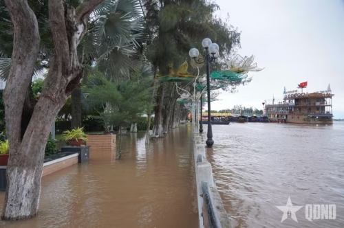 Mỗi khi triều cường dâng, lối đi bộ công viên Bến Ninh Kiều hòa cùng dòng sông Cần Thơ. |
