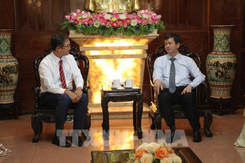 Ông Lê Quang Tùng, Bí thư Thành ủy Cần Thơ (bên phải) tiếp và làm việc với đoàn. Ảnh: Nguyễn Hằng - TTXVN |
