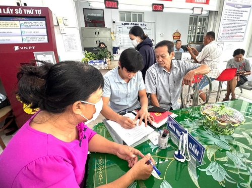 Người dân được hỗ trợ viết tờ khai bổ sung hồ sơ thực hiện thủ tục hành chính tại Trung tâm Phục vụ hành chính công phường Sóc Trăng. |