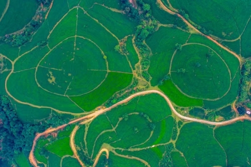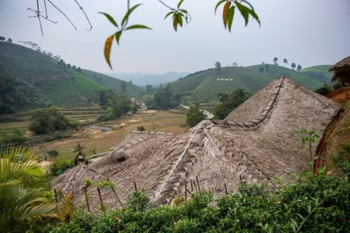 Hàng trăm ngọn đồi chè nằm xếp lớp san sát nhau, ở giữa là các lối mòn phục vụ việc đi lại, thu hái chè của người dân. Trên một số lối mòn quanh đồi, người dân trồng cây lớn có tán rộng để làm chỗ nghỉ ngơi khi đi thu hoạch chè. |