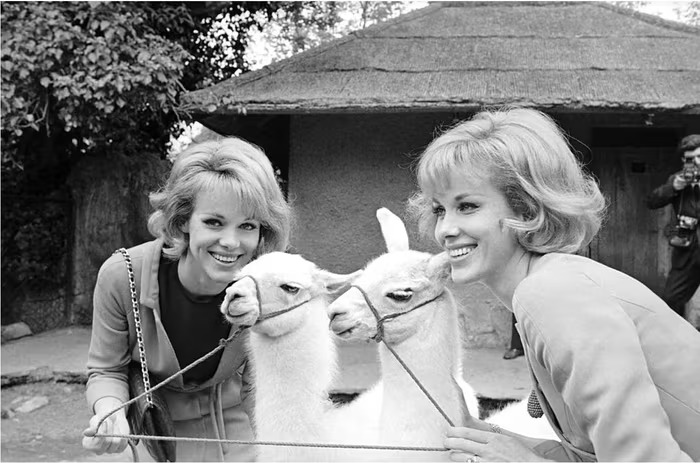 Cặp sinh đôi ở độ tuổi 40 tạo dáng cùng hai chú lạc đà sinh đôi tại Zoologico ở Rome, Ý (Ảnh: euronews) |