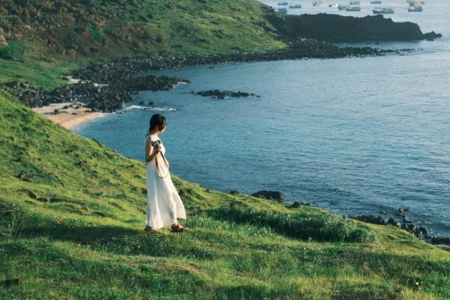 Phú Quý gây ấn tượng bởi những thảm cỏ xanh mướt dẫn ra biển cùng không gian thoáng đãng, yên bình. Ảnh: Khánh Huyền |