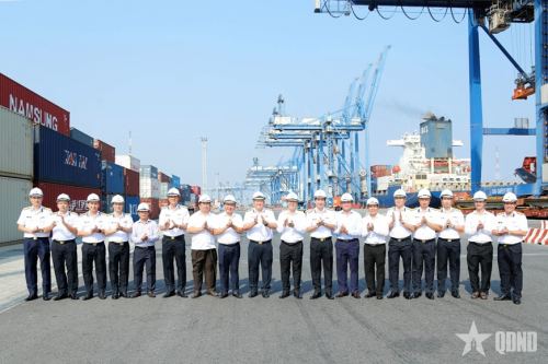 Đoàn công tác TP Cần Thơ chụp ảnh lưu niệm cùng lãnh đạo Binh đoàn 20 tại cảng Tân Cảng Cát Lái. |