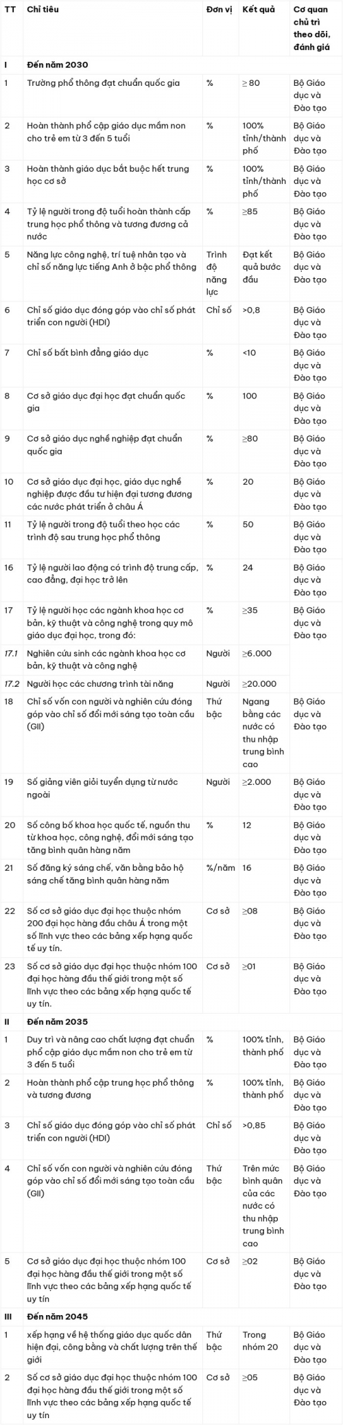 Chương trình hành động thực hiện Nghị quyết 71-NQ/TW về đột phá phát triển GD-ĐT nêu rõ các chỉ tiêu GD-ĐT cần đạt được đến 2030, 2035 và 2045.