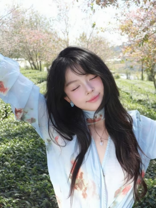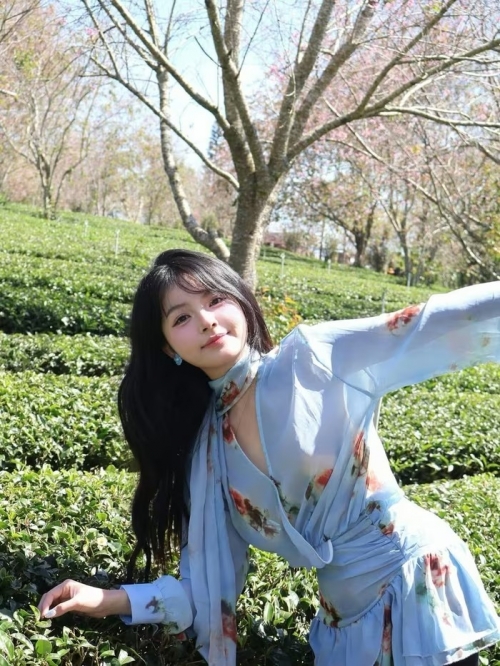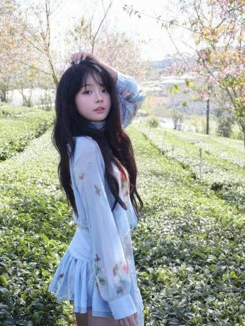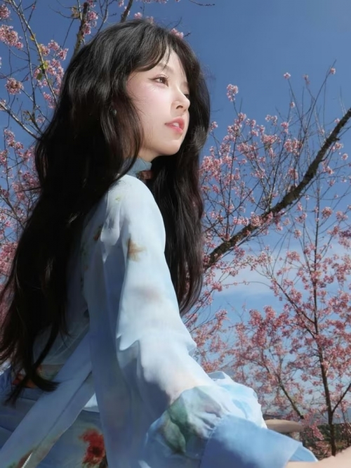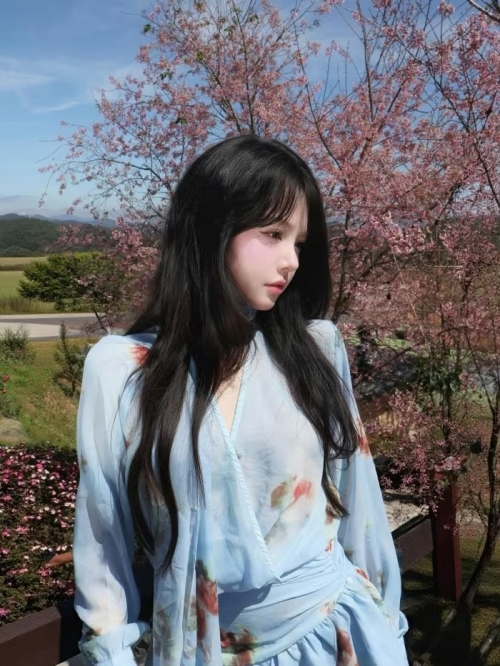 Trong bộ ảnh mới nhất, Uyên Nhi lựa chọn bộ trang phục voan xanh pastel nhẹ nhàng, điểm xuyết những họa tiết hoa tinh tế, cực kỳ ăn nhập với không gian lãng mạn của rừng mai anh đào. (Ảnh: IGNV) |