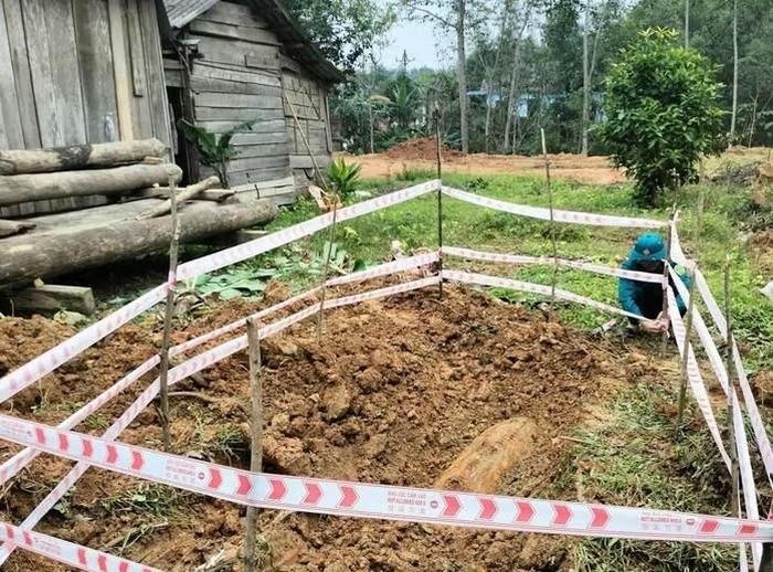 Tối 1/12, thông tin từ UBND xã Tuyên Lâm (tỉnh Quảng Trị) cho biết, trong lúc múc đất làm nền nhà, người dân địa phương phát hiện một quả bom lớn còn nguyên kíp nổ, nguy cơ gây mất an toàn cao.