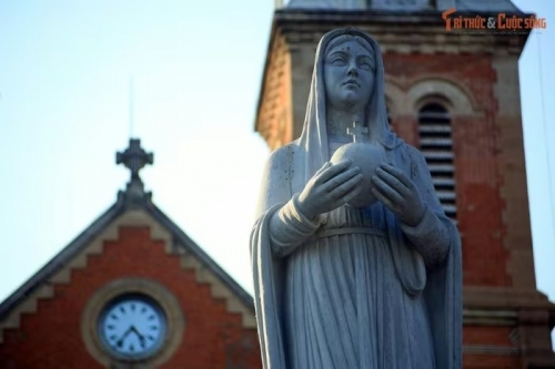 Tượng Đức Mẹ trước nhà thờ xuất hiện muộn hơn gần 80 năm. Tượng Đức Mẹ Hòa Bình bằng đá cẩm thạch được dựng năm 1959, không thuộc thiết kế ban đầu. |