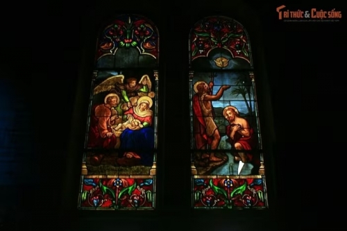 Bên trong có hệ thống kính màu rất tinh xảo. Các ô kính mô tả tích Thánh được chế tác tại Pháp, vừa trang trí vừa tạo hiệu ứng ánh sáng trang nghiêm. |