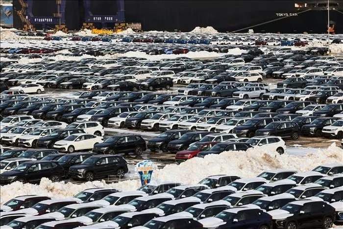 Xe ô tô chờ xuất khẩu tại cảng Yên Đài, tỉnh Sơn Đông, Trung Quốc. Ảnh: THX/TTXVN |