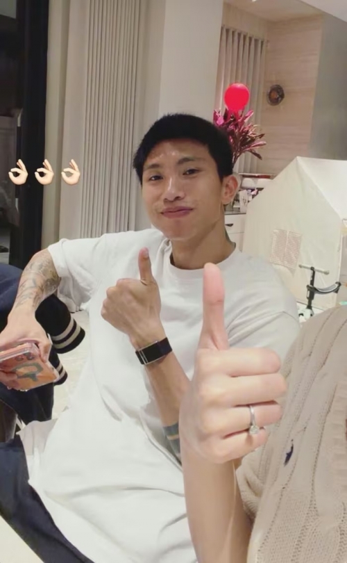 Tối 1/2, trên Instagram cá nhân, Doãn Hải My - bà xã của hậu vệ Đoàn Văn Hậu - đăng tải khoảnh khắc vui vẻ bên chồng. Trong ảnh, Văn Hậu nở nụ cười tươi, giơ ngón tay cái bày tỏ sự lạc quan.