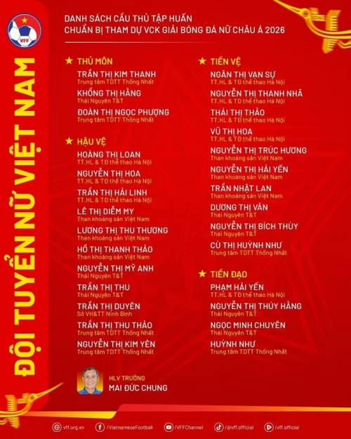 Ở đợt tập trung đầu năm 2026, HLV trưởng Mai Đức Chung triệu tập 28 cầu thủ tập huấn tại trung tâm Đào tạo Bóng đá trẻ Việt Nam. Bên cạnh đó, ban huấn luyện sẽ tiếp tục lựa chọn và bồi dưỡng các vận động viên trẻ tiềm năng. Cụ thể, một số cầu thủ trẻ hiện đang tham dự giải U19 nữ quốc gia sẽ được theo dõi, đánh giá trong quá trình thi đấu và có thể triệu tập lên đội tuyển sau khi giải đấu kết thúc (7/2).