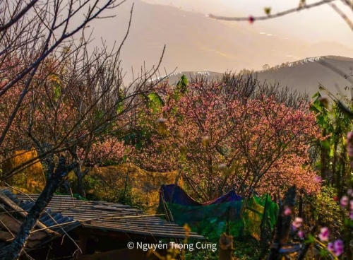 Không chỉ có hoa đào, Xím Vàng còn cuốn hút bởi vẻ đẹp nguyên sơ của thiên nhiên. Những buổi sớm, sương giăng bảng lảng trên các sườn núi, ruộng bậc thang hiện ra mờ ảo trong làn mây mỏng. Khi nắng lên, cả không gian bừng sáng, sắc hồng của đào hòa cùng sắc xanh của rừng, sắc vàng của nắng, tạo nên khung cảnh vừa hùng vĩ vừa thơ mộng. |