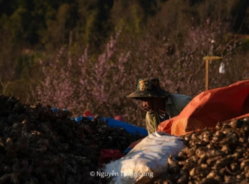 Đào rừng ở đây mọc tự nhiên, xen lẫn trong nương rẫy, ven suối, bên hiên nhà. Có cây đã già, thân xù xì, cành khẳng khiu nhưng mỗi độ Tết đến Xuân về lại bật lên những chùm hoa hồng phấn dịu dàng, báo hiệu một năm mới đang gõ cửa. Dưới tán đào, nhịp sống của người dân vẫn chậm rãi trôi: người đàn ông H’Mông cần mẫn bên nông sản, những đứa trẻ ngồi trước hiên nhà, tiếng chó sủa vang vọng giữa chiều muộn vùng cao. |