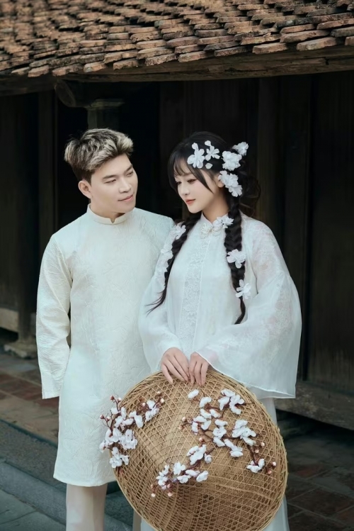 Trong khi Lyly Suri xinh đẹp như nàng thơ thì chú rể cũng rất bảnh bao trong bộ Áo dài nam cách tân màu trắng đồng điệu. (Ảnh: FBVN) |