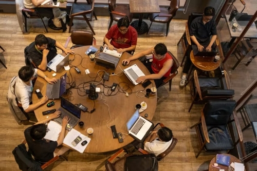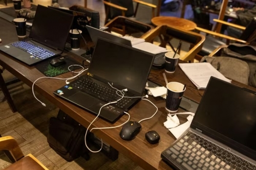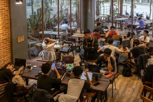 Điều đặc biệt tại quán cà phê này là những chiếc laptop nằm la liệt để "giữ chỗ" trong khi khách có thể ra ngoài đi ăn. Nhiều người thoải mái rời khỏi bàn và để lại vật dụng cá nhân tại quán. |