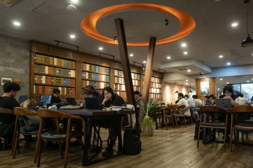 Laptop, dây sạc, sách vở phủ kín các dãy bàn tạo nên khung cảnh như một thư viện. Nhằm đáp ứng nhu cầu làm việc, học tập của khách, hầu hết chỗ ngồi đều được trang bị ổ điện. |