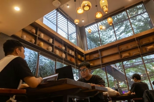 Khoảng 17h ngày đầu tuần, chỗ ngồi ở cả 2 tầng của quán cà phê gần như được lấp kín. Vị trí nằm bên hông ký túc xá khu B ĐHQG-HCM, gần các trường đại học trong khu vực, giúp quán luôn tấp nập sinh viên, đặc biệt trong thời gian cao điểm như mùa thi cử. |
