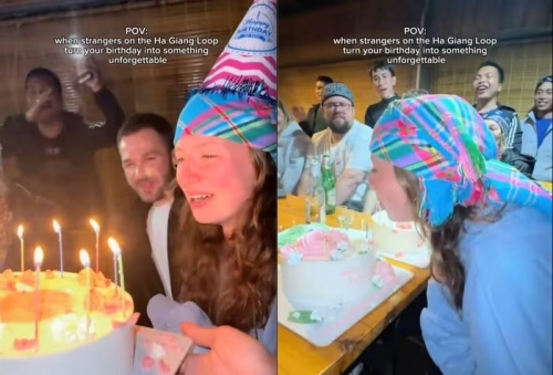 Nữ du khách Đức gọi đây là "sinh nhật tuyệt vời nhất từng có". Trong đoạn video đăng tải trên tài khoản cá nhân, cô bày tỏ: "Khi những người xa lạ trên cung đường Hà Giang biến ngày sinh nhật của bạn thành một kỷ niệm không thể nào quên".