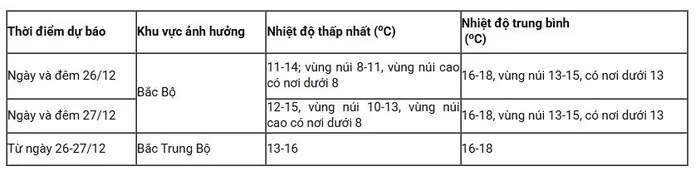 Ở khu vực Bắc Bộ và Bắc Trung Bộ trời rét, riêng khu vực vùng núi Bắc Bộ trời rét đậm, có nơi rét hại. Nhiệt độ thấp nhất trong đợt không khí lạnh này ở khu vực Bắc Bộ và Bắc Trung Bộ phổ biến 11-14 độ, vùng núi Bắc Bộ 8-11 độ, vùng núi cao có nơi dưới 8 độ.