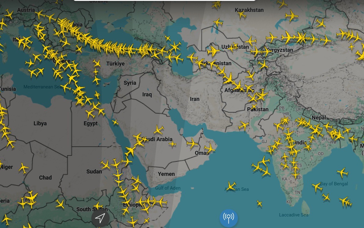 Không phận trên Iran, Iraq, Kuwait và Jordan gần như không có chuyến bay nào. Ảnh: Flightradar24 (cập nhật vào lúc 10:00 sáng, ngày 2-3) |