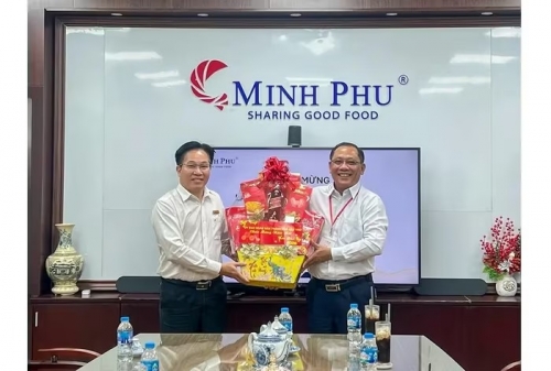 Phó Chủ tịch UBND TP Cần Thơ Trần Chí Hùng tặng quà cho đại diện Công ty cổ phần thủy sản Minh Phú - Hậu Giang. Ảnh Mỹ Hòa/BCT |