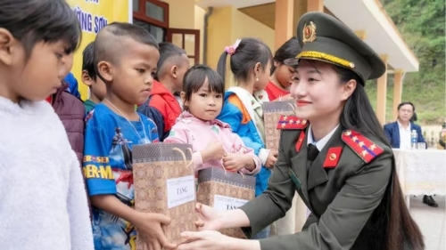 Các nữ chiến sĩ Công an trao tặng 70 suất quà cho học sinh tại các điểm trường của Trường phổ thông dân tộc bán trú tiểu học Trường Sơn. |