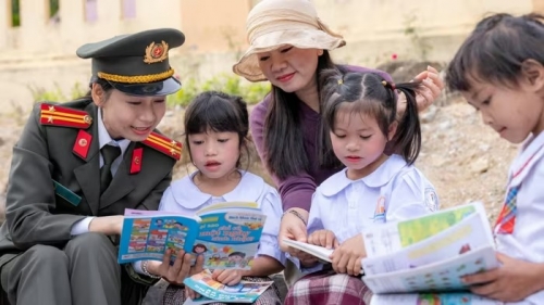 Các cô trong đoàn của Phòng Công tác chính trị, Công an tỉnh Quảng Trị và Thư viện tỉnh hướng dẫn và cùng các em đọc sách nhằm khơi dậy văn hóa đọc trong lứa tuổi học sinh. |