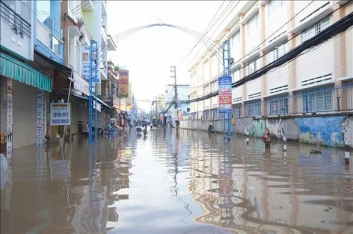 Đường Bùi Hữu Nghĩa, phường Bình Thủy biến thành sông khi triều cường lên vào sáng 8/10. Ảnh: Thanh Liêm/TTXVN |