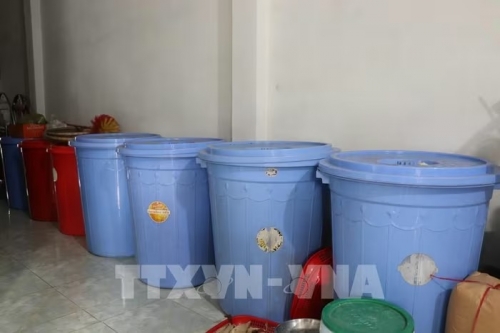 Để đối phó với tình trạng “nước lúc có lúc không”, không gian quanh nhà của các hộ dân ở các khu vực ven biển TP.Cần Thơ thành “kho” chứa nước với nhiều thùng phuy, xô, chậu. Ảnh: Thu Hiền - TTXVN |