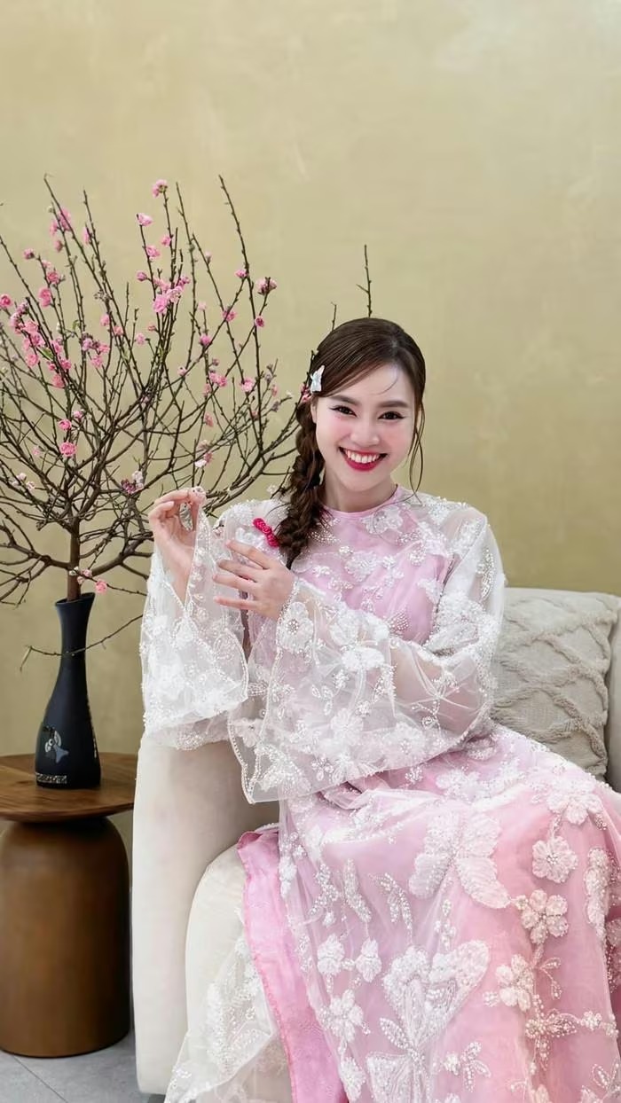 Ở những khoảnh khắc đời thường, Lan Ngọc xuất hiện trong không gian ấm áp với áo dài hồng pastel thêu hoa tinh xảo, kết hợp lớp voan mỏng tạo hiệu ứng mềm mại, nữ tính. Nụ cười rạng rỡ cùng kiểu tóc tết gọn gàng giúp cô ghi điểm bởi vẻ trong trẻo, duyên dáng. Ảnh: FBNV |