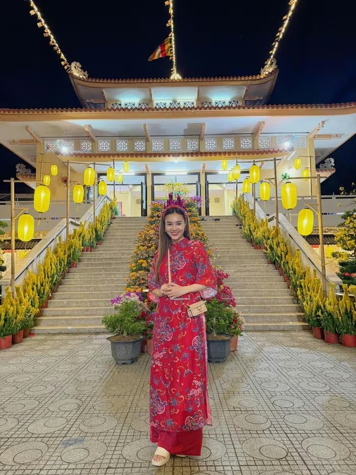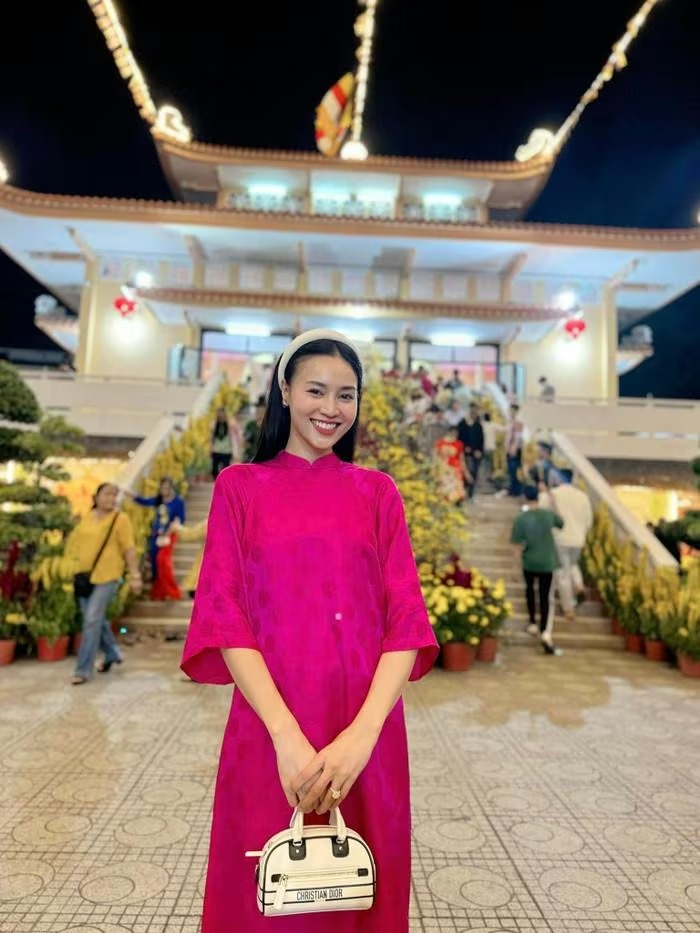 Trong một bối cảnh khác, khi diện áo dài hồng fuchsia tại không gian chùa về đêm, Lan Ngọc mang đến hình ảnh tươi tắn, rạng rỡ nhưng vẫn giữ trọn sự trang nhã vốn có của trang phục truyền thống. Ảnh: FBNV |
