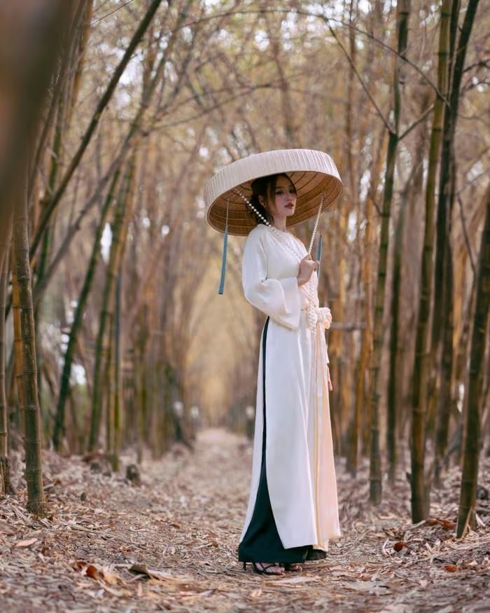 Khi kết hợp cùng nón lá và khung cảnh rừng tre, Lan Ngọc gợi lên vẻ đẹp mộc mạc, trầm lắng, giàu chất thơ. Vóc dáng mảnh mai cùng vòng eo thon gọn giúp cô chinh phục trọn vẹn nhiều chất liệu, từ lụa mềm mại đến gấm sang trọng. Ảnh: FBNV |
