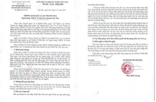 Thanh tra Ngân hàng Nhà nước (NHNN) chi nhánh Khu vực 14 đã công khai Thông báo Kết luận thanh tra đối với Ngân hàng TMCP Á Châu chi nhánh Cần Thơ (ACB Cần Thơ). Kết quả thanh tra cho thấy ACB Cần Thơ còn một số tồn tại, hạn chế trong hoạt động cấp tín dụng.