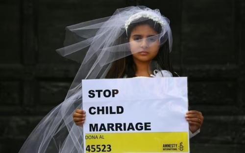 Một diễn viên nhí hóa thân vào vai nạn nhân của tảo hôn tại một sự kiện do Tổ chức Ân xá Quốc tế tổ chức |