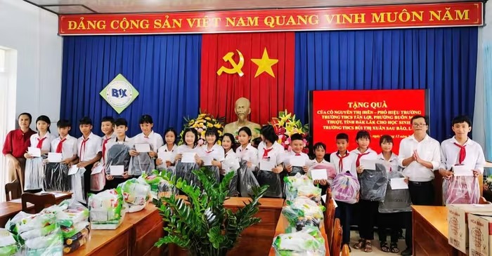 Học sinh Trường THCS Bùi Thị Xuân, xã Xuân Lộc (Đắk Lắk) đón nhận món quà ý nghĩa của bà Nguyễn Thị Hiên trao tặng. |