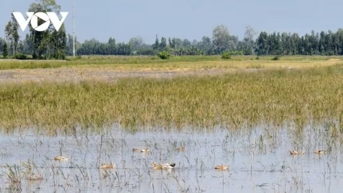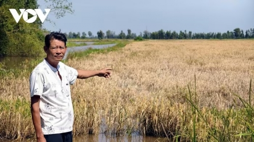 Trên cánh đồng ấp Mỹ Lợi B, anh Lý Tấn Lộc đứng lặng nhìn 12 công lúa đã ngập sâu, không thể thu hoạch. Giọng còn đầy xót xa anh kể, khi lúa vừa làm đòng, mưa bắt đầu kéo dài cộng thêm triều cường dâng quá nhanh khiến bơm tát không kịp. Toàn bộ diện tích đành bán rẻ cho chủ vịt, dù trước đó anh đã bỏ vào hơn 20 triệu đồng tiền đầu tư.