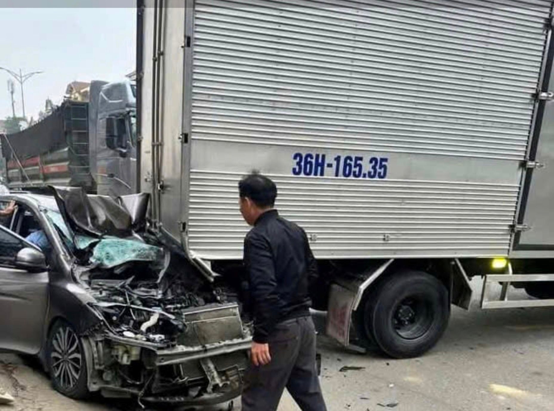 Thời điểm trên, khi nhiều ô tô đang xếp hàng dừng chờ đèn đỏ theo hướng Thanh Hóa – Hà Nội, bất ngờ một xe đầu kéo mang biển kiểm soát Thanh Hóa từ phía sau lao tới, tông vào đuôi xe ô tô con biển kiểm soát 36A-320.xx.