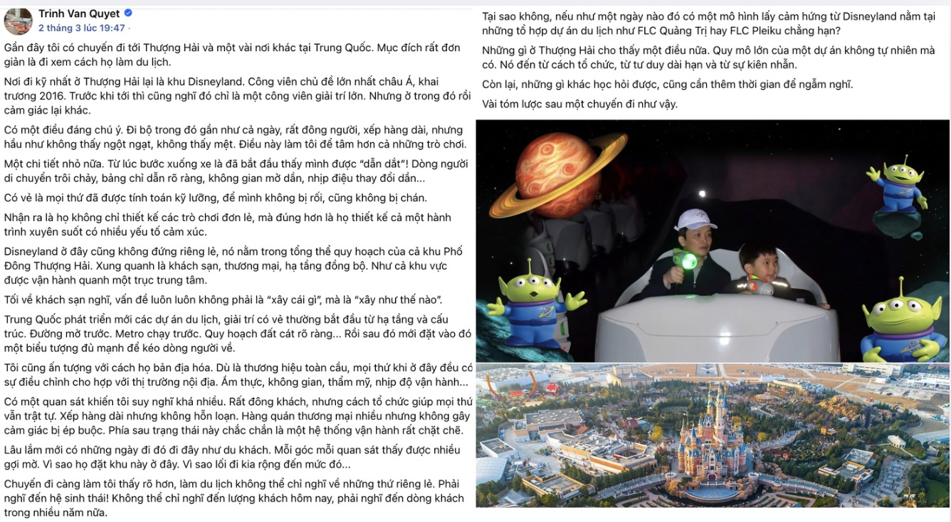 Mới đây, trên trang Facebook cá nhân, ông Trịnh Văn Quyết, nhà sáng lập Tập đoàn FLC và Bamboo Airways đã chia sẻ những ghi nhận đáng chú ý sau chuyến đi tới tại Thượng Hải và một số địa phương của Trung Quốc. Mục đích chuyến đi, theo ông, là để quan sát cách họ tổ chức và phát triển du lịch.