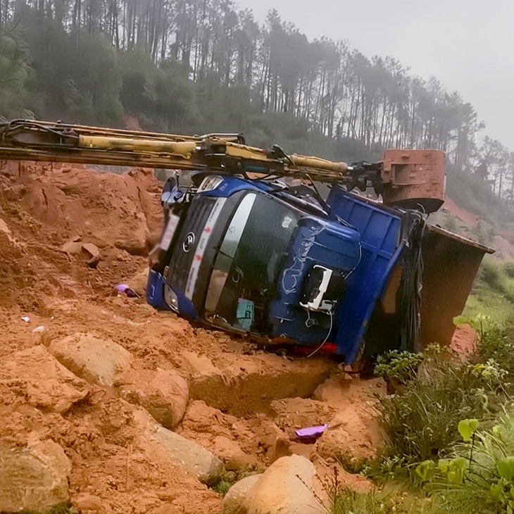 Đến hơn 16h cùng ngày, các công nhân đang làm việc thì tiếp tục xảy ra sạt lở khiến 2 công nhân bị thương ở chân và tay. Một chiếc máy múc và một chiếc xe tải bị đất đá đổ xuống lật nghiêng.